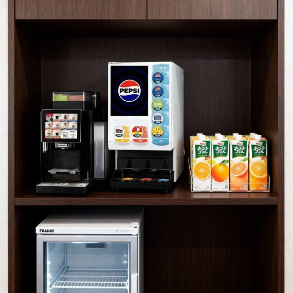 豆から挽くタイプのコーヒーマシンやカフェオレ、ココア、紅茶、お茶などのフリードリンクコーナーがパワーアップ。みそ汁やスープ、ナッツやラムネも加わり、小腹も満たせるリフレッシュコーナーに生まれ変わりました。