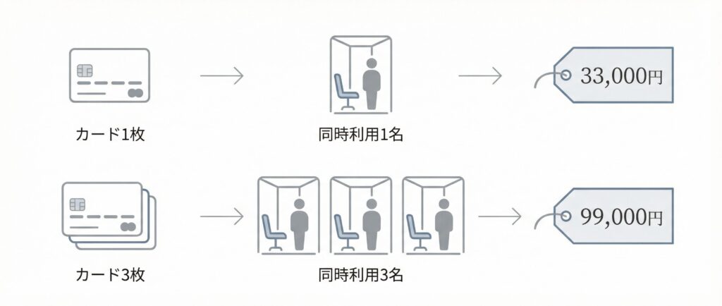 「同時に使える人数(=同時滞在枠)」=「発行カード枚数」で決まります。カードは社内共有OK(利用者は入れ替わり自由)ですが、同時利用できるのは発行枚数までです。