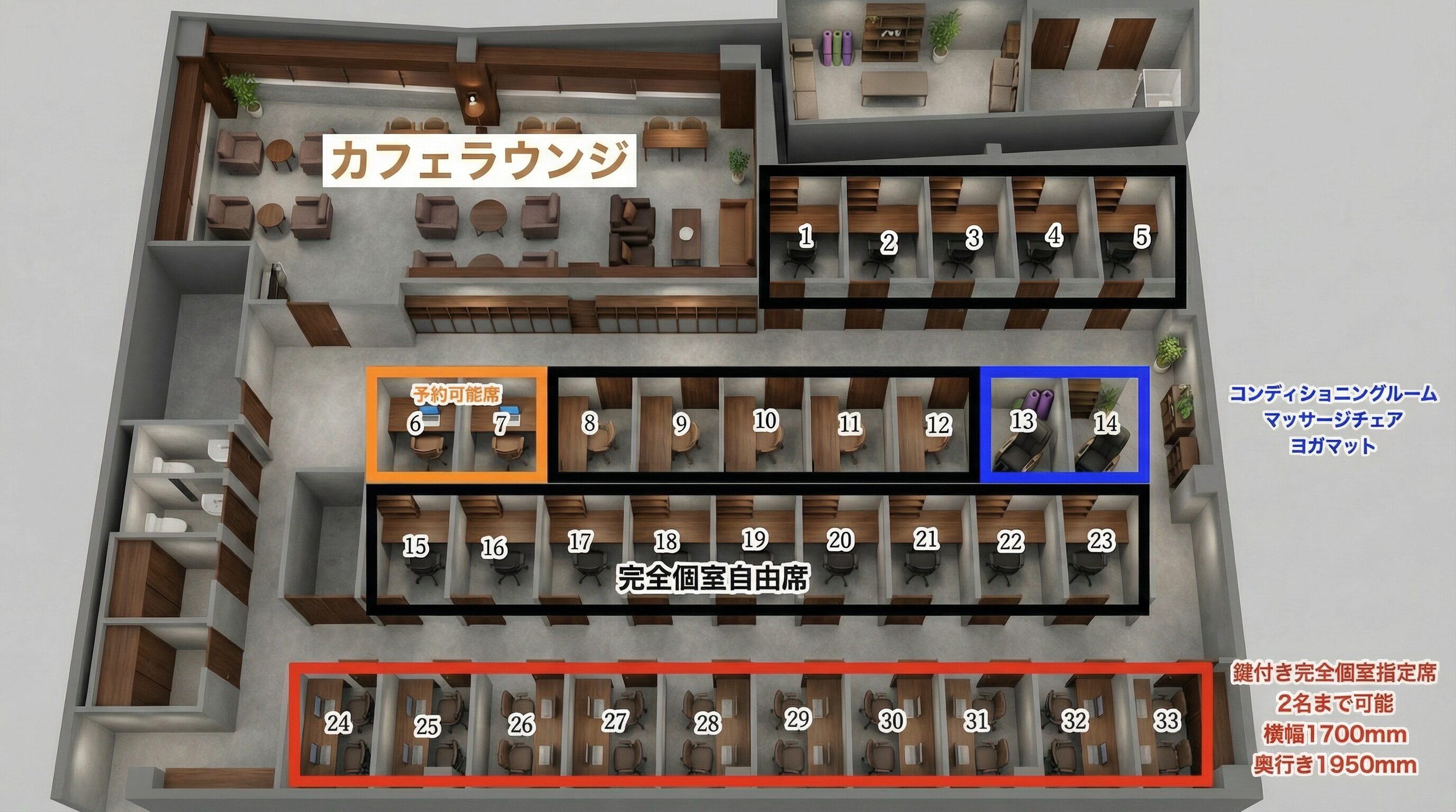 ・WEB会議OKの完全個室・自由席21席(予約も可能・Wi-Fi/電源あり)